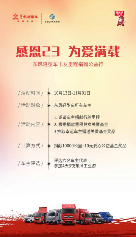“感恩23,为爱满载”东风轻型车公益行活动自10月13日开启,每位东风轻型车车主可以通过线上报名的方式参与,捐献自身的行驶里程。每位参与到活动中的东风轻型车卡友,更有机会抽奖获得油卡、华为智能手机、化妆品、学习机等多项大礼,用以孝顺父母,关爱妻子,呵护孩子,真正让每位卡友师傅实实在在把爱带回家,让爱和欢乐传递给身边最亲密的人。